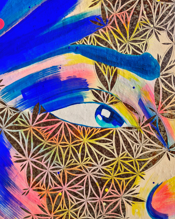 Manyoly signe le sujet, les couleurs et la technique de la rouille au sel, qui donne texture et profondeur. Tibo Papercut y ajoute la précision de ses découpes, une véritable dentelle de papier qui dialogue avec la peinture.