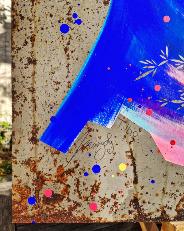 Ce tableau est une collaboration entre Manyoly et Tibo Papercut. Il clôt une série de cinq œuvres uniques réalisées sur métal, où chacun apporte sa manière de travailler.