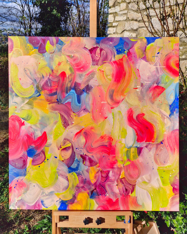 Dans ce deuxième tableau de la série, les couleurs se fondent les unes dans les autres pour créer un mouvement continu et organique. Les formes s’effacent au profit d’une énergie fluide, où chaque nuance se dilue et renaît dans la suivante. Fusion explore cette rencontre des pigments et des gestes, révélant une composition à la fois intense et parfaitement équilibrée.